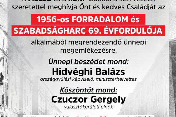 A Fidesz-KDNP országgyűlési képviselője, a Miniszterelnöki Kabinetiroda miniszterhelyettese, parlamenti államtitkára, Hidvéghi Balázs lesz a vendég október 22-én a Fidesz-KDNP budaörsi szervezetének megemlékezésén. A rendezvény 17 órától kezdődik a templomkertben. Köszöntőt mond Czuczor Gergely, a Fidesz-KDNP Pest megye 2. számú választókerületének elnöke.